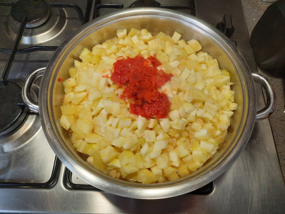 - Layer the tomato paste, salt, paprika, and garlic over the zucchinis.