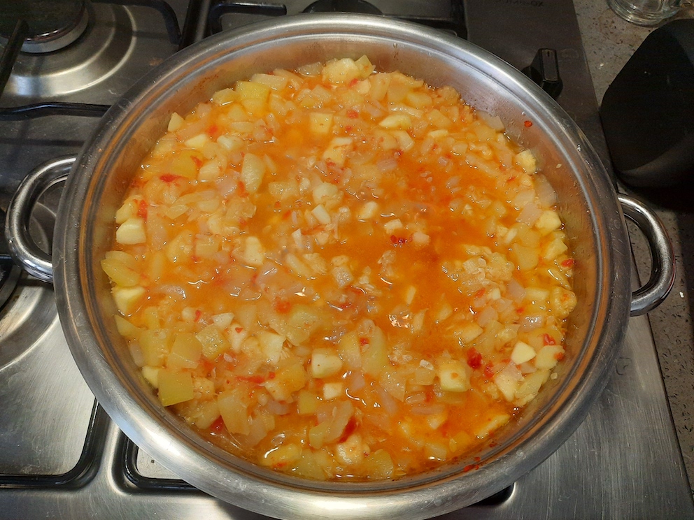 - Add the onion to a pot, then the olive oil and zucchinis.