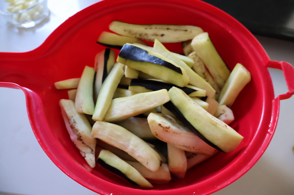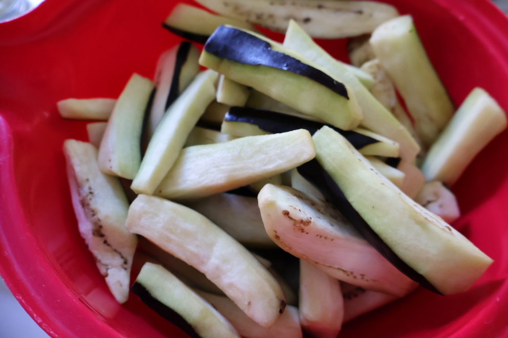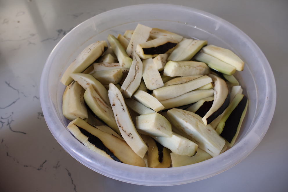 - Wash and cut the eggplants, soak in salted cold water for 30 min.