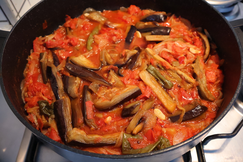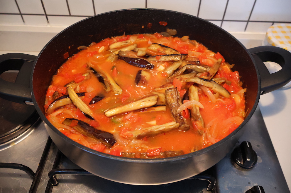 - Pour hot water over the mixture, then add baked eggplants on top.