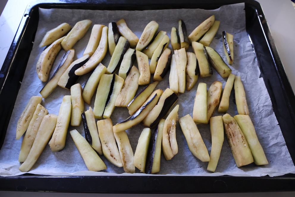 - Place eggplants on a baking tray and bake at 200°C for 30 min.