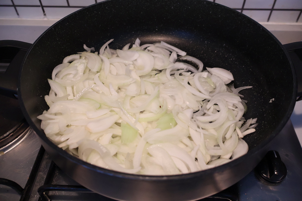 - Sauté onions with half a tea glass olive oil over medium-low heat.