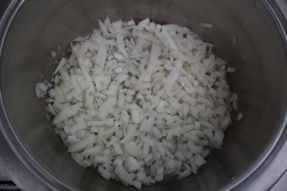 - In a pot, sauté onion in olive oil on low heat until soft.