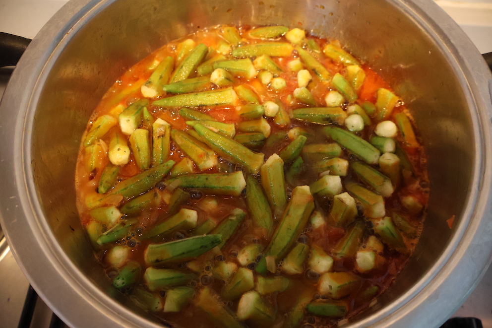 - Add paprika, salt, hot water, lemon juice, and okra.