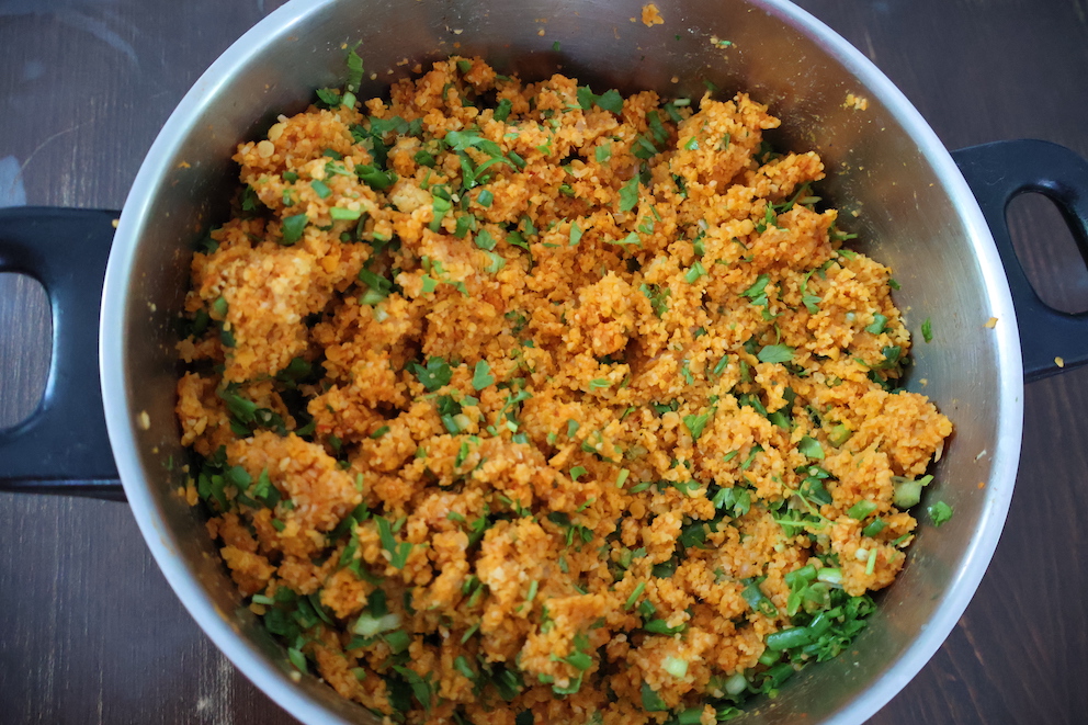 - Mix cooked paste and onion with lentil-bulgur mixture, add salt, pepper, cumin, and paprika.