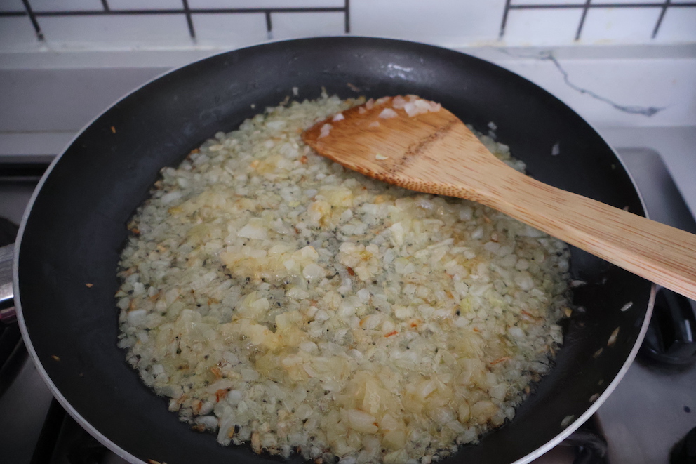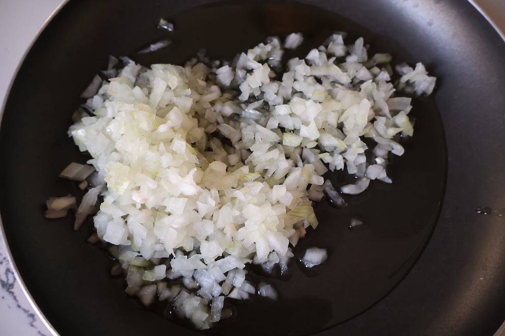 - In a pan, heat olive oil. Chop onion into small cubes and sauté on low for 10 minutes.