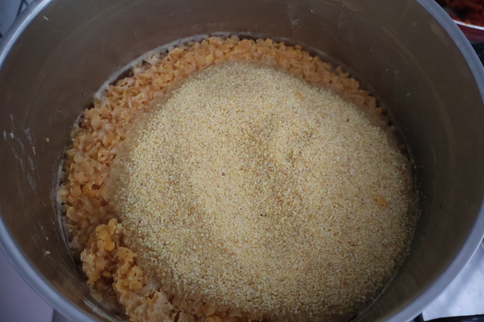 - Turn off the heat, add bulgur, mix, and cover. Let bulgur sit in lentils for 30 minutes to soften. Add a little hot water if too dry.