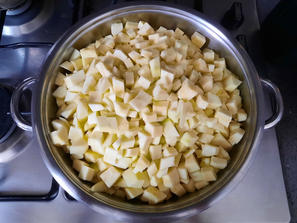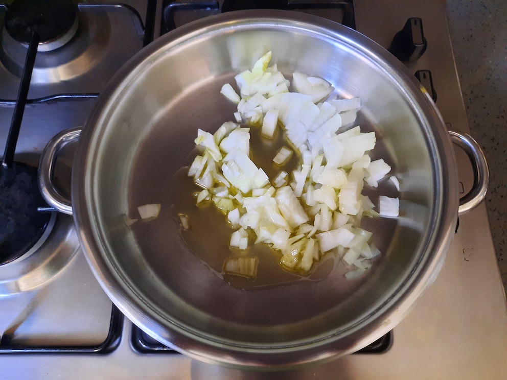 - Add the onion to a pot, then the olive oil and zucchinis.