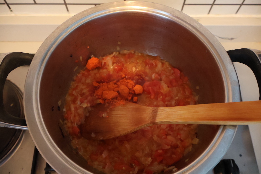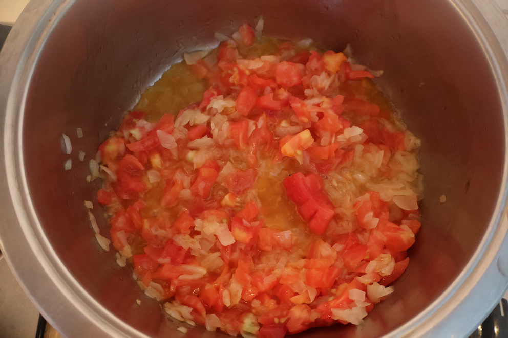 - In a pot, sauté onion in olive oil on low heat until soft.