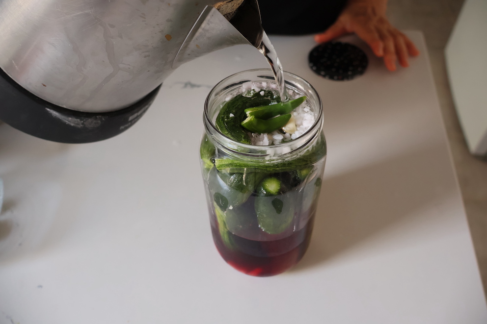- Add salt, sugar, vinegar, citric acid, and hot peppers to the jar.