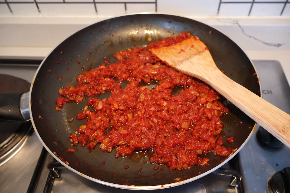 - Add tomato and pepper paste to onions and cook for 7-8 minutes on low heat.
