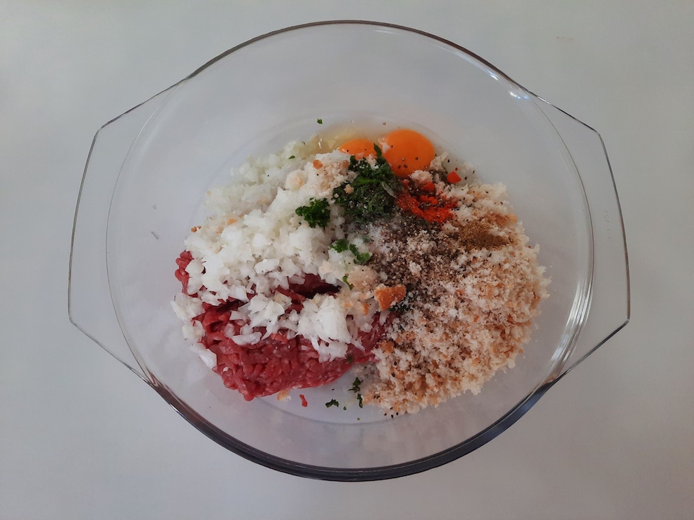 - Add the minced meat, egg, bread crumbs, baking soda, black pepper, salt, thyme, garlic, and chopped parsley. Knead for 10 minutes.