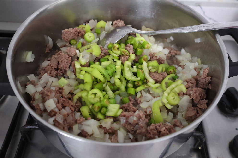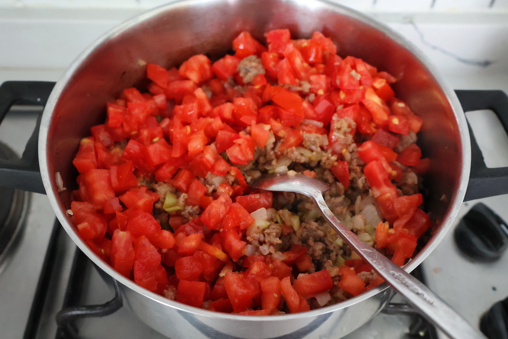 - Add peppers to the meat and continue cooking. When peppers soften, add tomato paste. After paste cooks slightly, add tomatoes.