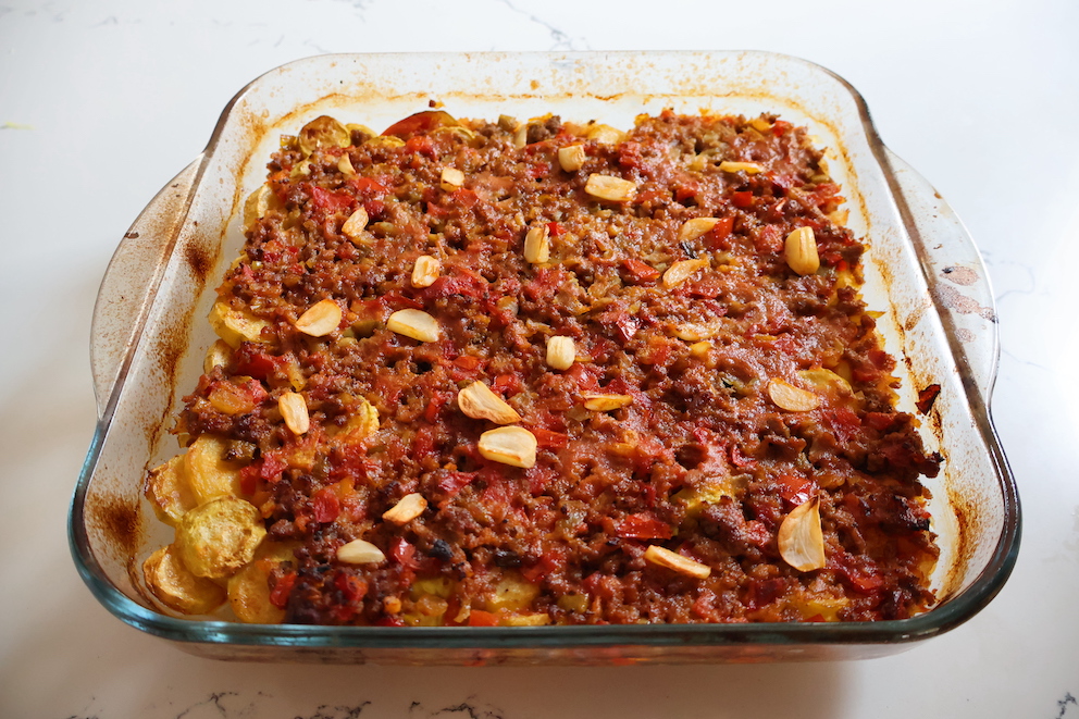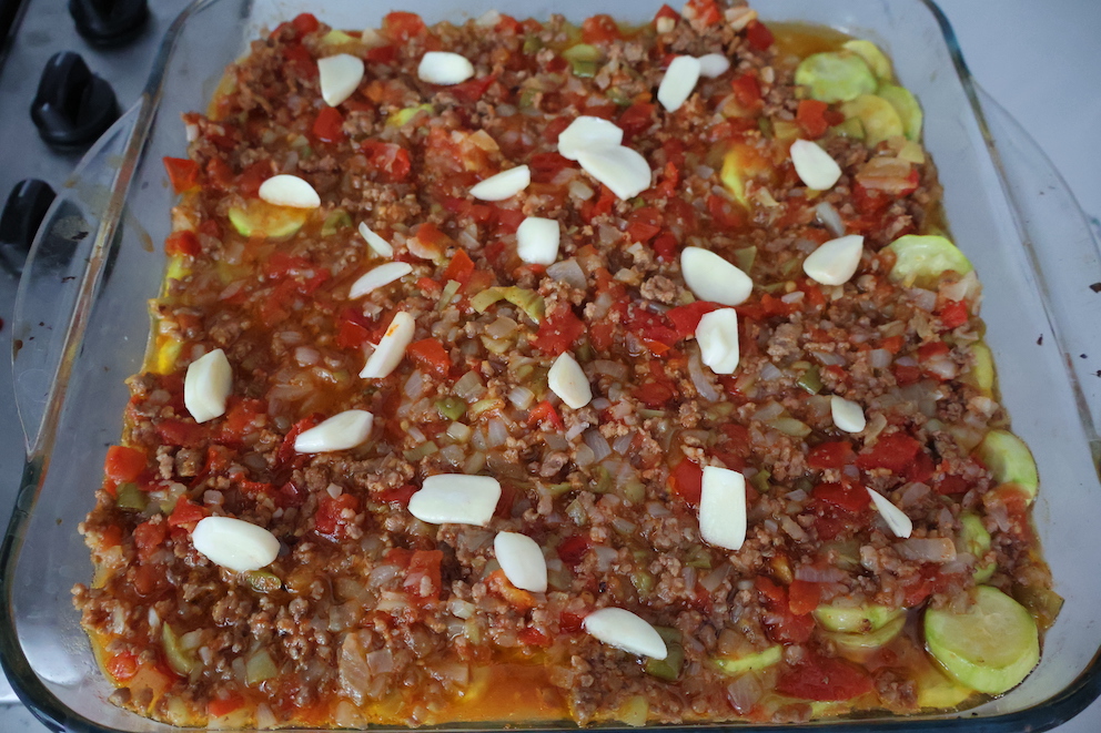 - Remove zucchinis from the oven, pour the meat mixture over them. Arrange sliced garlic on top and bake in preheated 200°C oven for 20 minutes.
