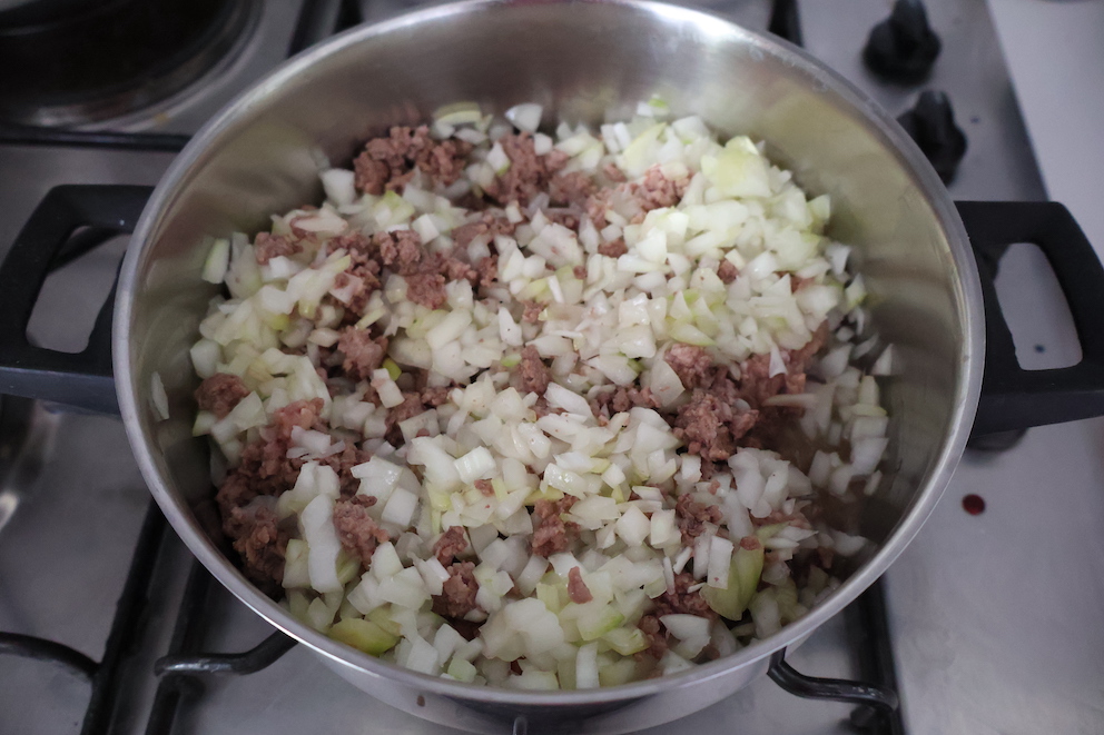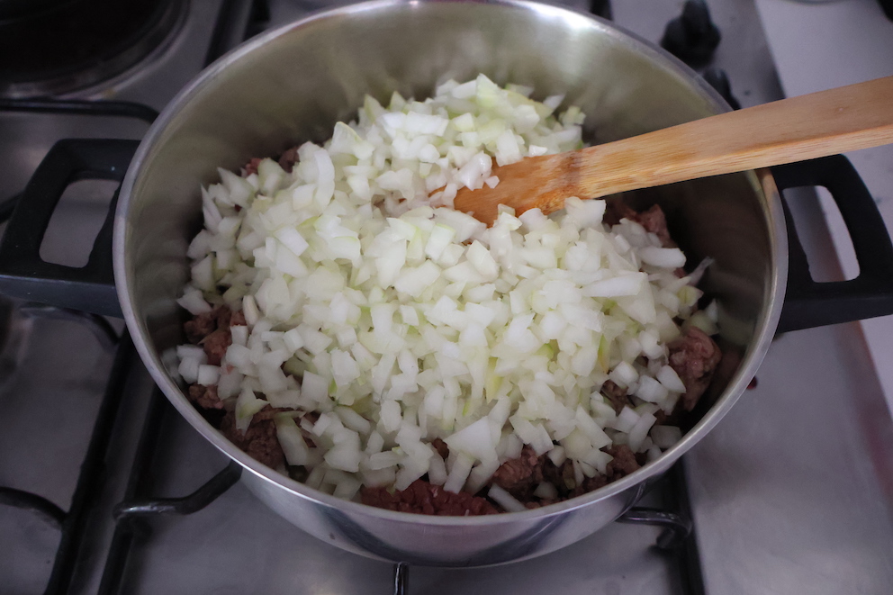 - Sauté minced meat on low heat. After lightly browning, add 1/4 tea glass olive oil and onions, cover, and continue cooking.