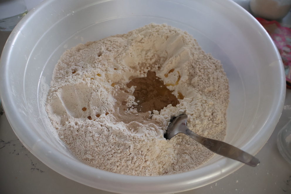 - Place 5 cups of whole wheat flour and half a cup of all-purpose flour into a large mixing bowl (reserve half a cup for kneading).