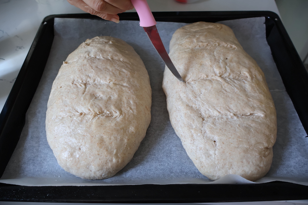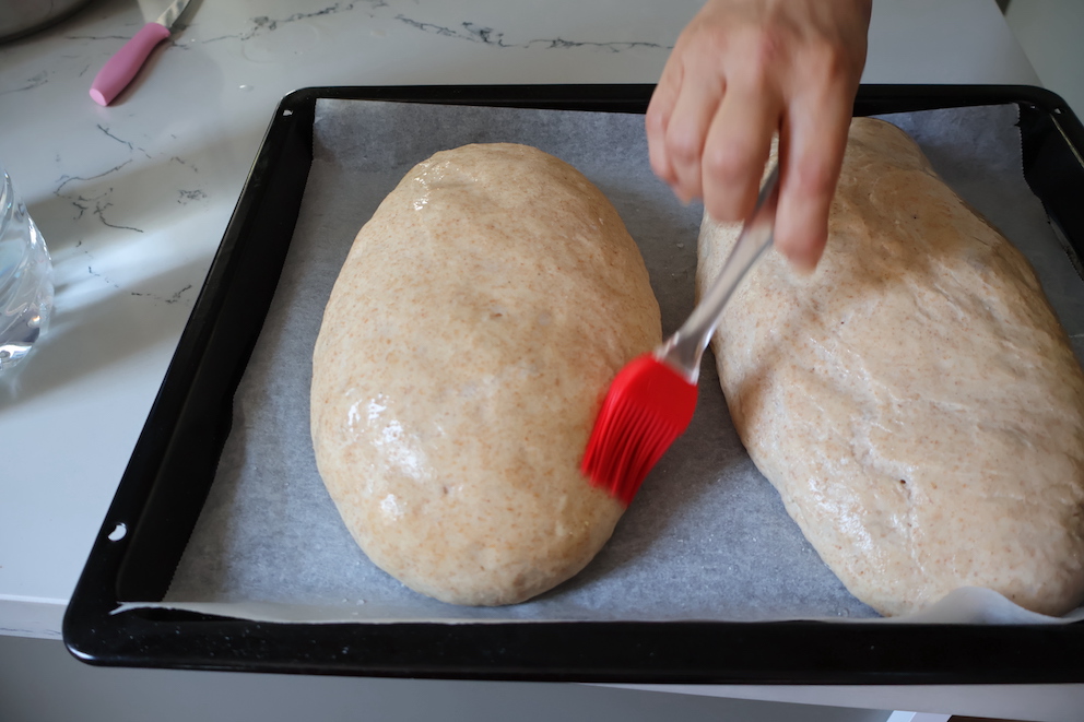 - Before baking, brush the top of the bread with water and make shallow cuts with a knife.