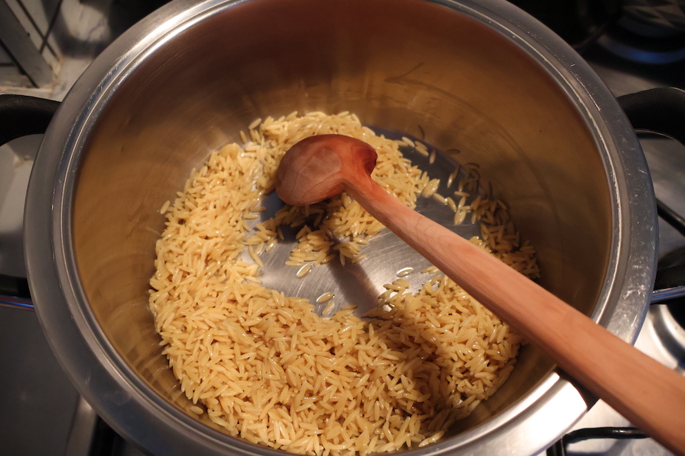 - Heat the olive oil in a pot. Add the orzo and garlic, sautéing them together until the orzo is lightly toasted.